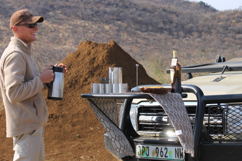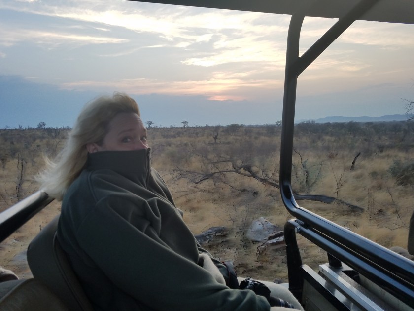 After dinner we returned to our villa with the safety of a guide, since there were wild dogs in our compound that night. The next morning’s alarm call came all too soon, and by 5:30am we were showered and ready to go. We had a quick snack of rusks, coffee and tea before setting off into the chilly darkness, but we were dressed for it, and our Jeep had warm blankets to offset the cold.