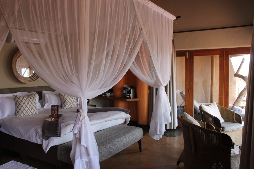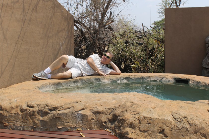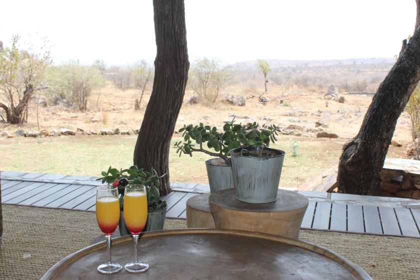 We were treated to our own table for two at lunch, as the rest of the resort’s guests were still out on their morning game drive, so we had the place entirely to ourselves, with our own server. A nice caprese salad arrived, followed by chicken, risotto and a delicious side of collard greens. Sadly, Simon’s glass of wine was blown over by a gust of wind and landed in his starter, but his glass was soon re-filled (although the table-cloth was Ieft soaking in chardonnay!).