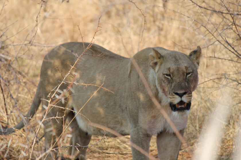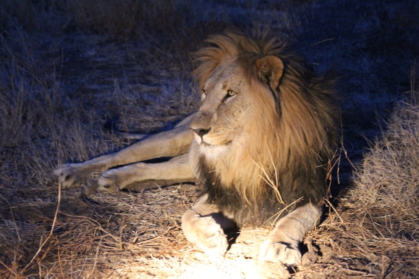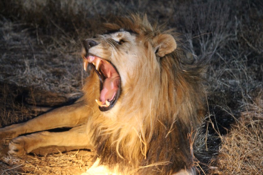 A male lion had been spotted at the watering hole before the elephants arrived, so Sean decided we’d track him down. We tracked him for an hour, with Sean catching sight of the lion but then losing him when he flopped down in the long grass. As the sky darkened we were rewarded with a full-throated roar. We didn’t so much hear the roar as feel it, a full bass growl that registered in our solar plexus’. With that, Sean took the vehicle through thorn scrub and long grass until he spotted the lion on the other side of a gulley. The lion roared again and when we found him Sean pulled up right next to him, which startled us a bit. Quite a bit, actually.