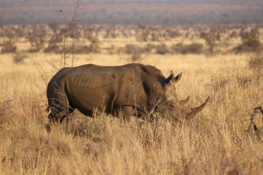 Sean decided we would track three male lions who had been hanging out along the reserve’s Southern fence. He spotted their tracks fairly easily, as it had rained the night before, but he kept saying, “They’re going this way. Now they’re going the opposite direction…” over and over, for nearly 2 hours. We covered a lot of ground, but finally gave up. We did see a huge male rhino during that time, who didn’t like us very much as we were a terrible distraction from the job at hand. He was on the scent of a female, so he loped off quickly.