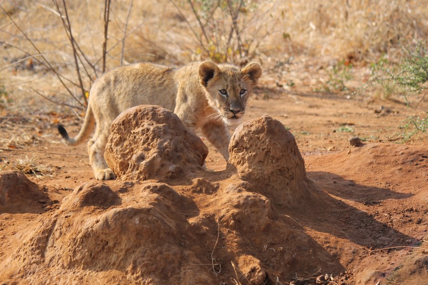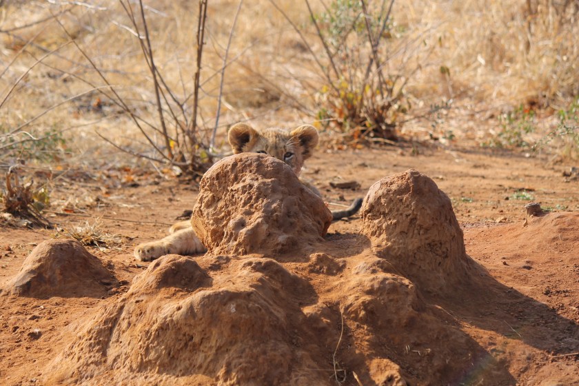 When the babies had been fed they lay down with mama nearby, but one cub got up and ambled our way. When he saw our vehicle he stopped in his tracks, trying to hide behind a termite mound. Sean said he would take his cue from the other lions, and when they showed no reaction the cub knew it was safe. He was so cute and furry, with an obvious personality of his own. What a special thing to see! It made our whole day.