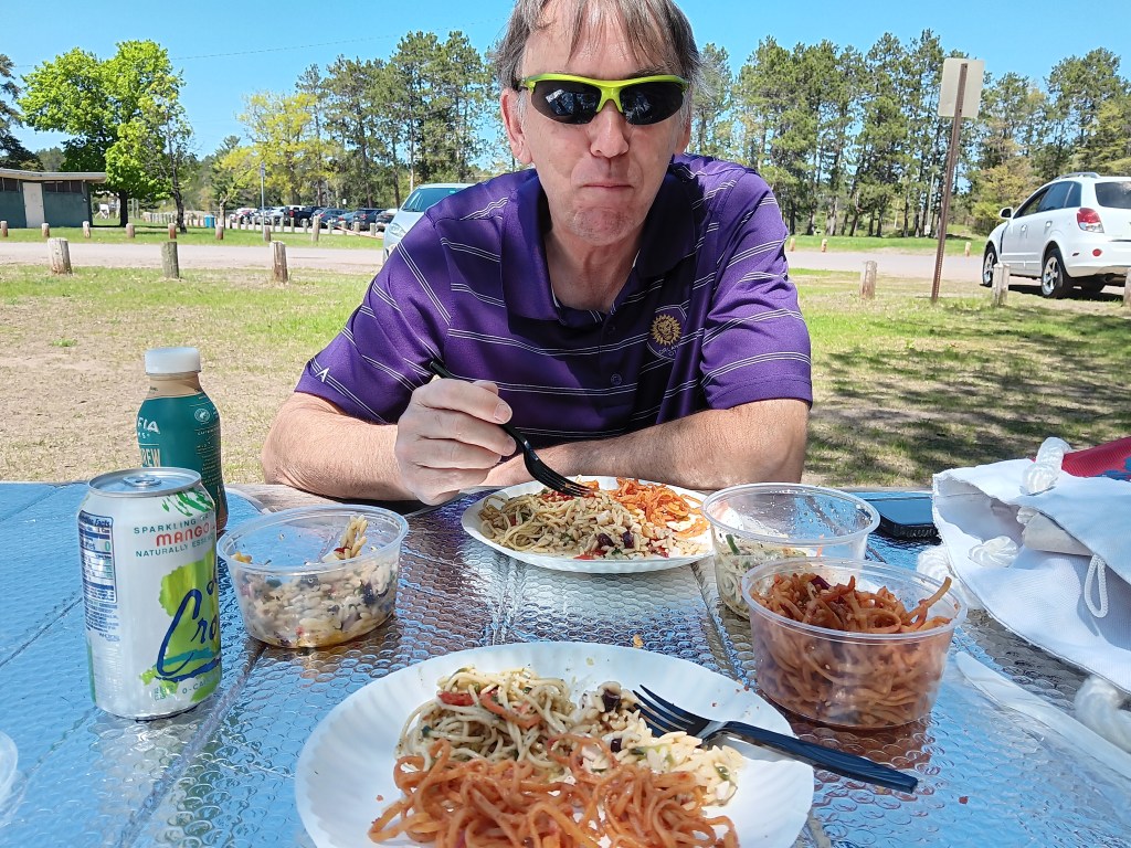 Three little pasta-based salads, an iced coffee, and a sparkling water later (with a scone thrown in for good luck) we ventured over to the sadly-named Dead Lake (so called not because it’s dead, or people who use it get dead, but because the Native people here recognized it as a place where their ancestors dwell), and after a small false start we came upon Tourist Park, a cozy picnic table in the sun, and a little girl named Amelia who fell in love with Ruthie. Lunchtime perfection!