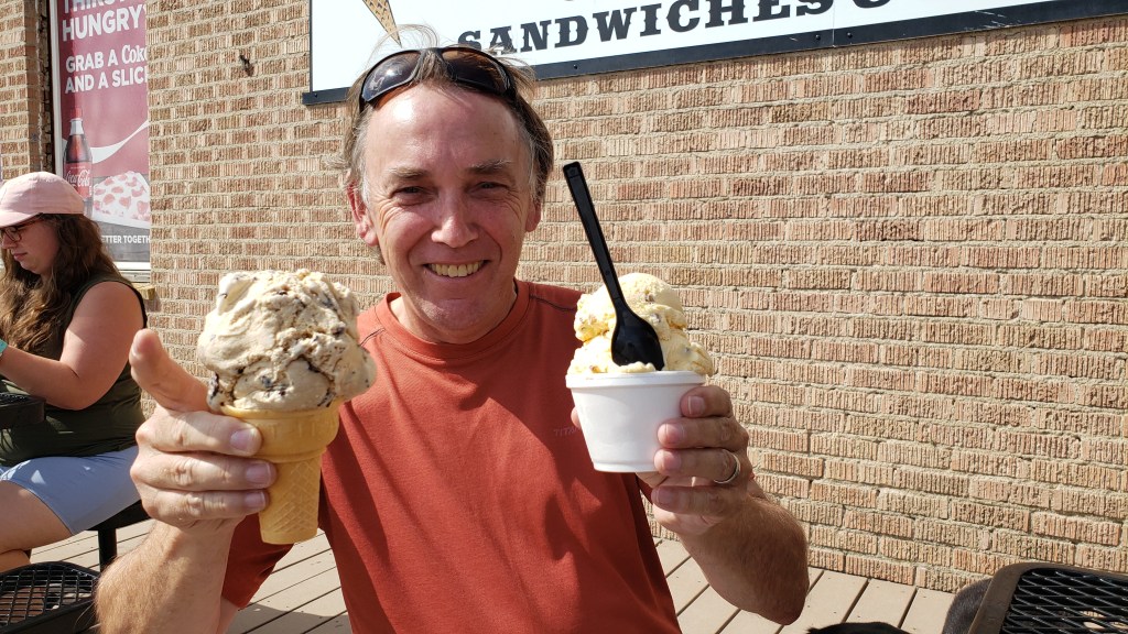 Susan ate less than half of hers, Simon powered through his, and we spent a happy hour talking to the locals who joined us on the patio. One was a rancher having a treat with his grandson, and he told us all about his farm, and how he’d never been to Florida because he had no desire to “go to the other side of the world.” All the people we met were just passing through the tiny town, but insisted you “have to stop for an ice cream” when you’re here.