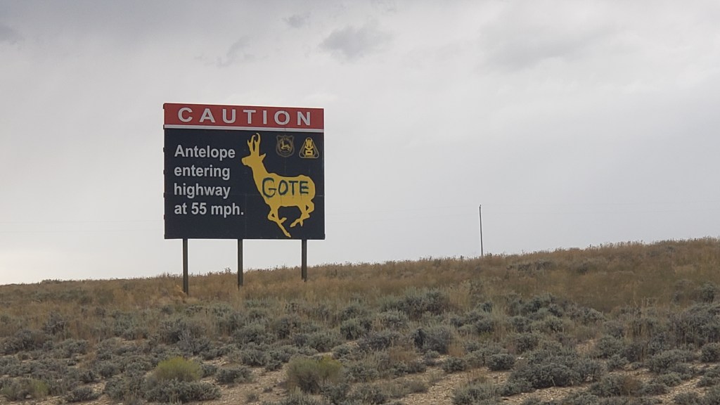 We saw lots of wacky signs warning of local dangers, such as cows and speedy “antelope,” (which aren’t antelope at all, they’re pronghorn, but that’s an argument for another day).