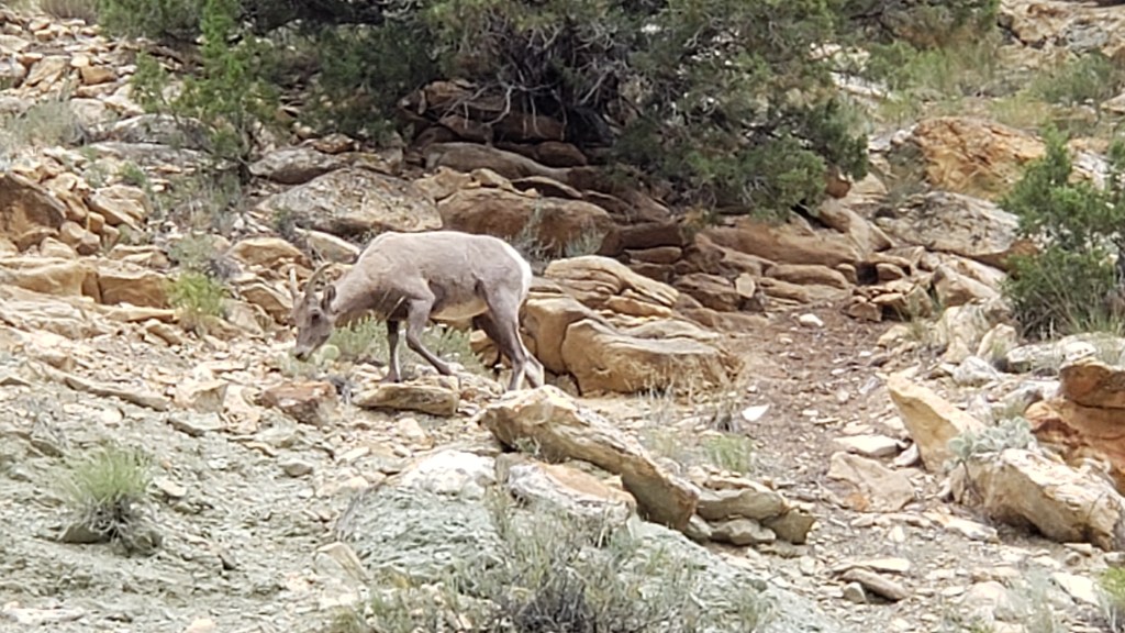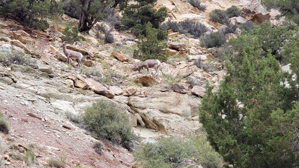We took hundreds of mountain photos, as you can imagine, but we’ll stop there. Instead, enjoy these two Bighorn Sheep, who blend into the landscape so well it was surprising we saw them at all.
