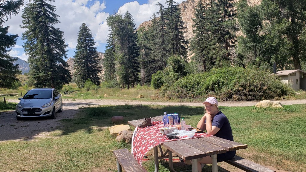 We pulled off into a tent-camping area before leaving the canyon, and had the kind of lunch we were growing used to (meaning, odd). This time it was frozen carrots, cherry tomatoes, Paul Newman Italian Dressing in a packet we picked up at the lodge in Yellowstone, Triscuits, bread, and sausages.