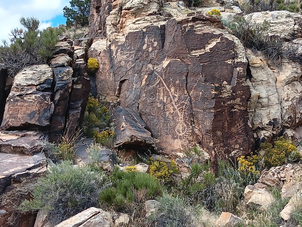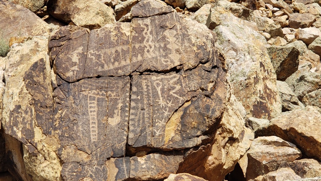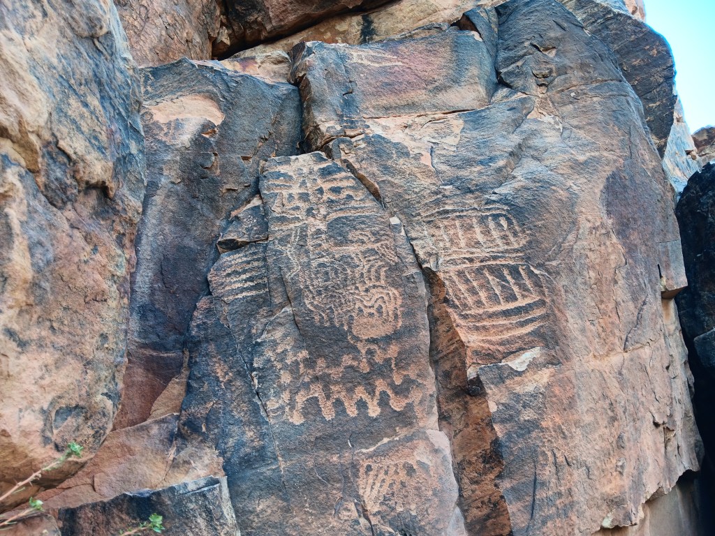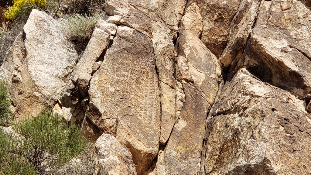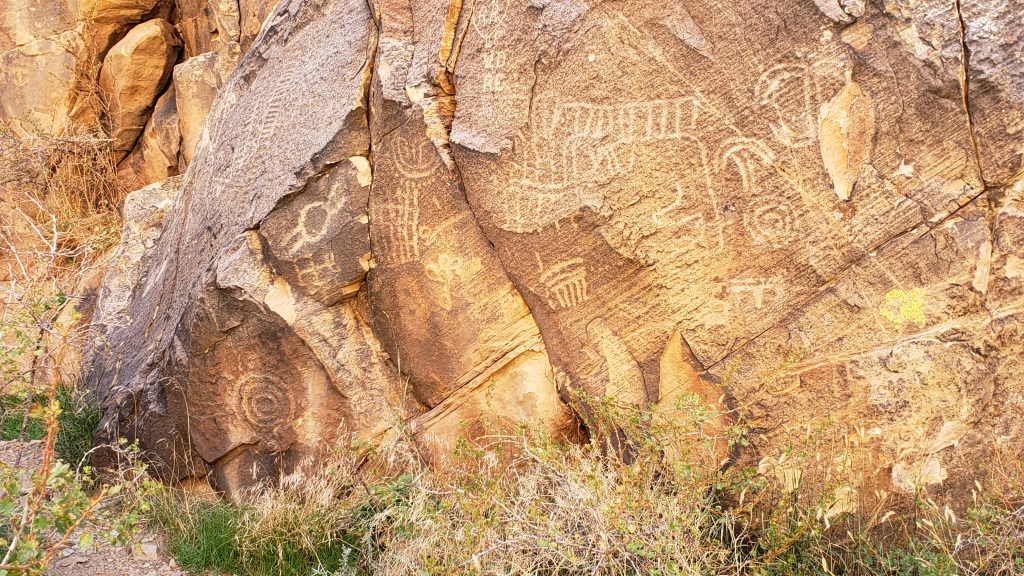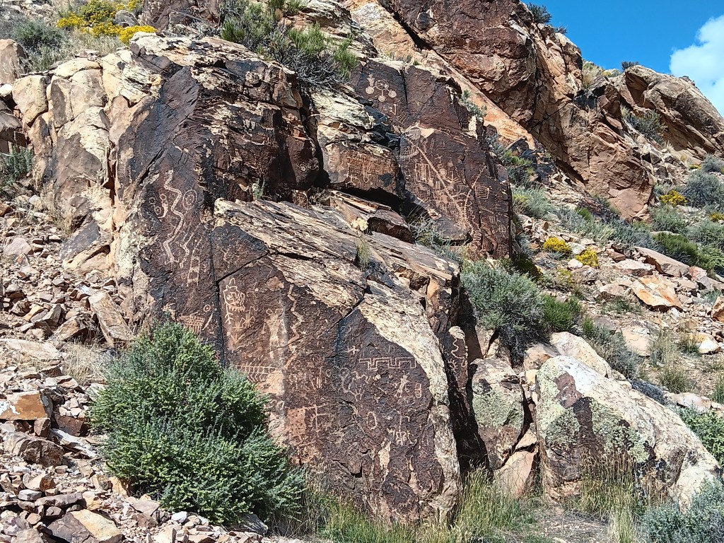 The petroglyph roughly in the center of the photo is now called the Zipper Glyph, for obvious reasons. Its meaning isn’t known, but it’s thought to be a marker of travel days, first one way then another, from the summer solstice (the circle at the bottom). It may have been used as a means of tracking where game would be throughout the seasons.