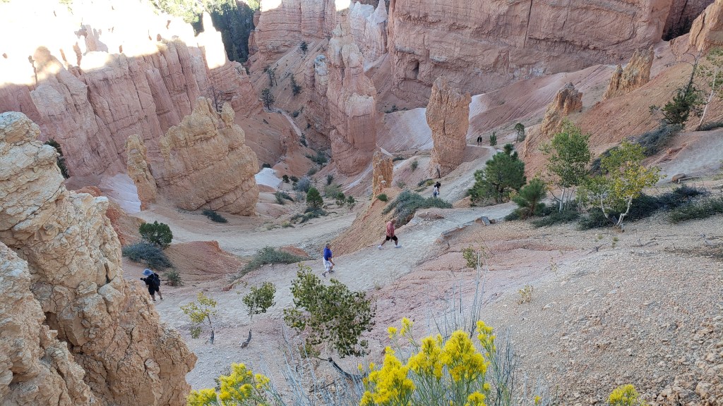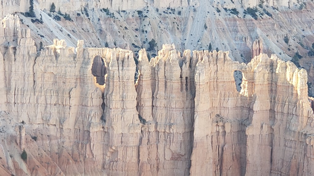 From the Badlands in North Dakota to Utah’s magnificent landscapes, we’ve repeatedly said, “How did that happen?” The short answer is, wind, water, and time. The longer answer in Bryce is, its distinctive formations began as flat rock on an ancient sea bed, uplift of land that created plateaus, which then weathered into “walls” with vertical gaps between them, then into “windows” (big holes in the rock, like we saw in Arches), and finally into the oddly-shaped, sticky-uppy hoodoos we see today.