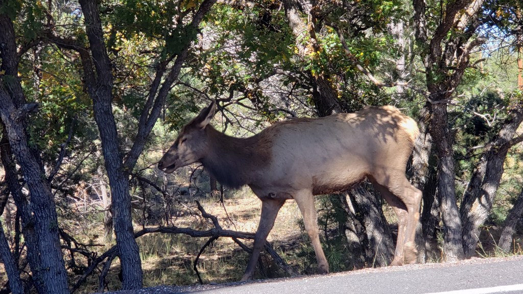 Skipping the steep road also led to our first wildlife sighting in a long time when we came upon five or six elk grazing along the East Rim road, which made for a happy sign-off to our visit.