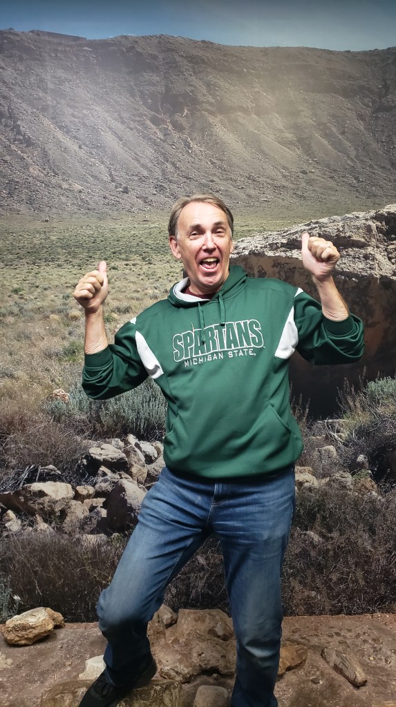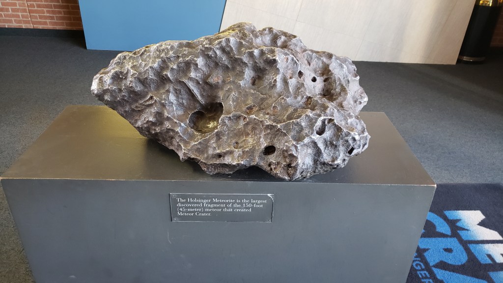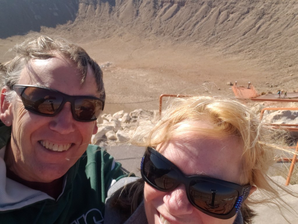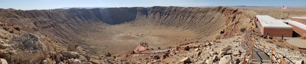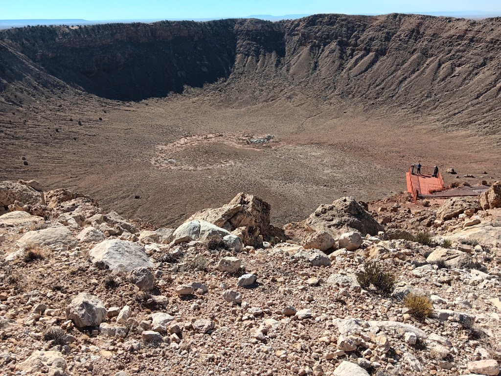 Meteor Crater is big. Very big indeed. The crater is 4,000 feet wide, 700 feet deep, and was created when a meteor hit at 26,000 miles per hour, 50,000 years ago. We stood on the edge and felt the pull of the wind that whips around inside and threatens to suck you in.