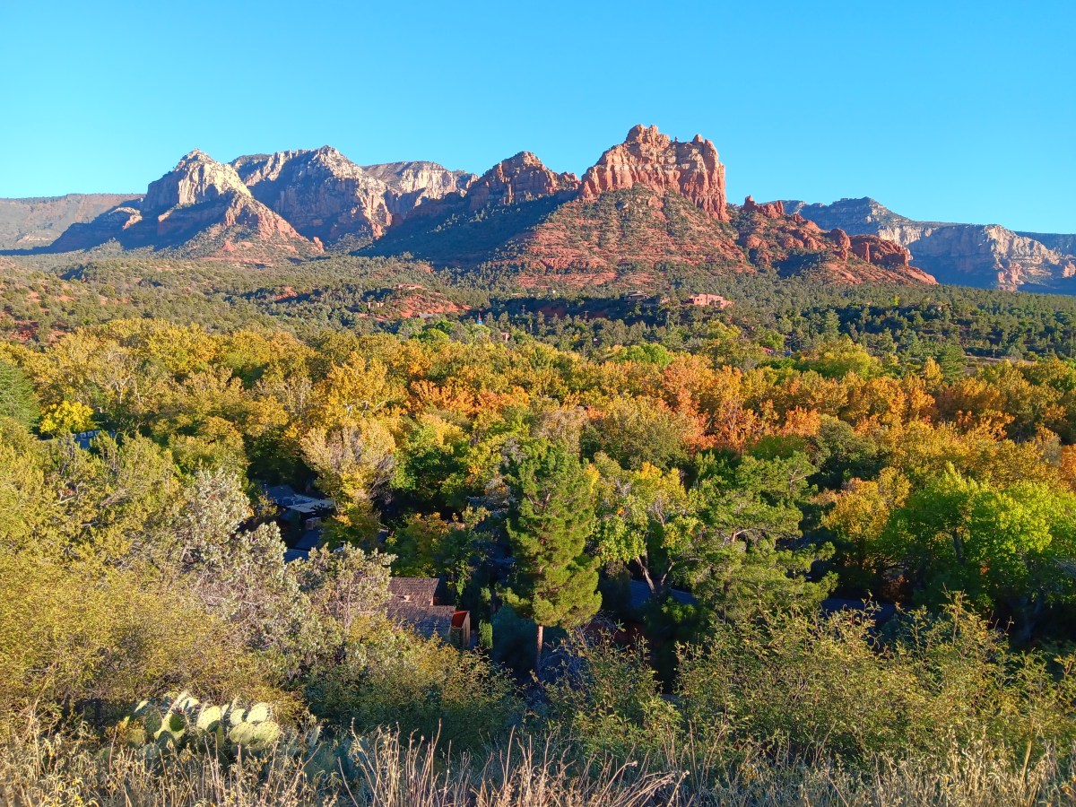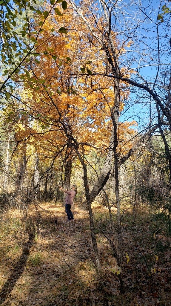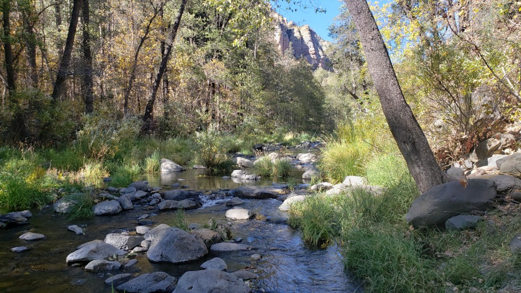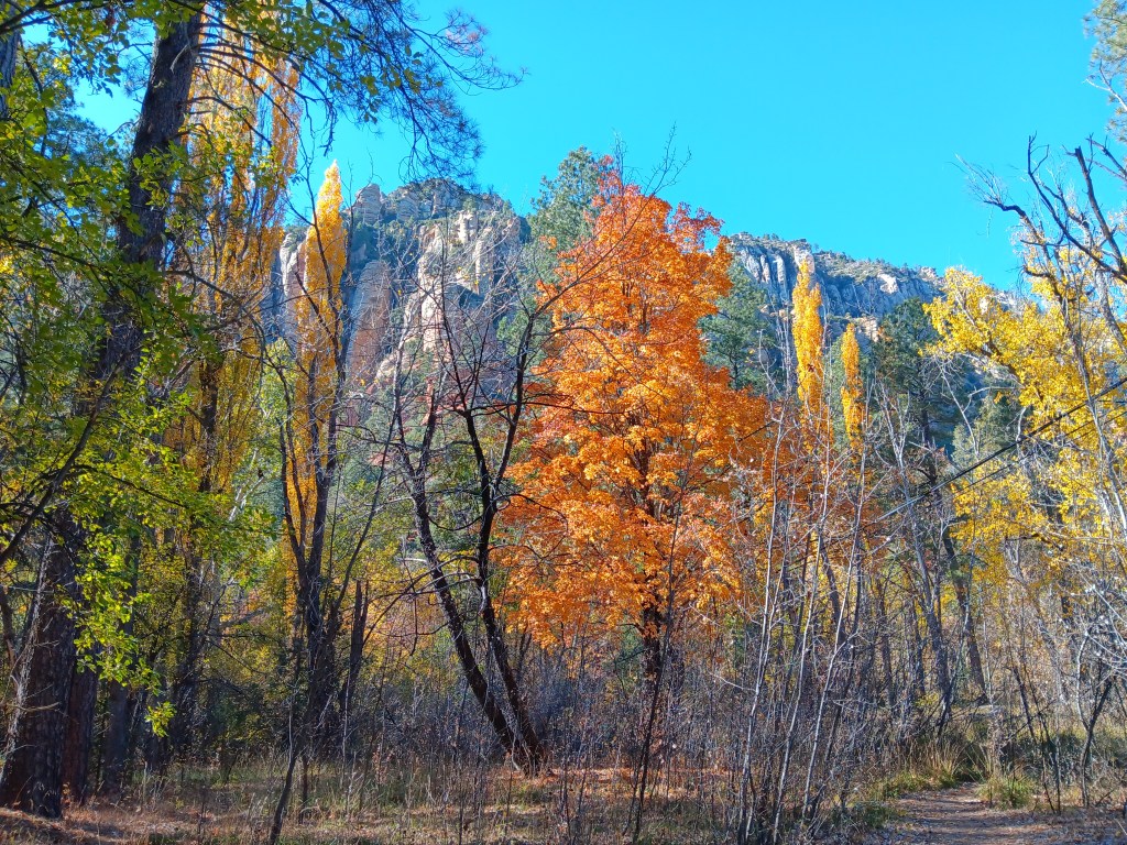 Heading south on I-17, we quickly began to descend out of the mountain along a road with a series of switchbacks, and we couldn’t believe what we were seeing. Glorious hillsides covered in trees showing off their fall colors, towering rock formations that seemed to reach to the sky, and, further down, a river that actually flowed in a state where most rivers are bone-dry most of the time. Could there really be a place on Earth this enchanting? It felt so right.