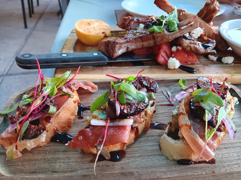 We had dinner that first night at dog-friendly Creekside American Bistro, where we each had a cocktail, and we split Lamb Chop Lollipops and Fig and Blue Cheese Crostini. Superb!