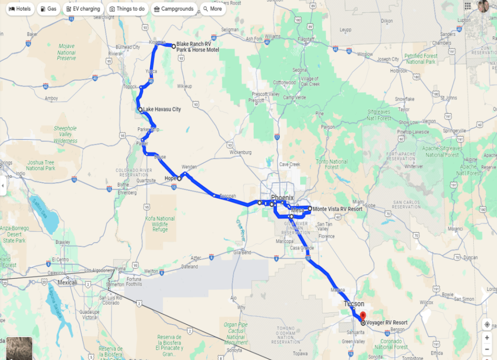 Below are two maps showing just the last month of our travels, from Kingman in Arizona to Tucson, via sparkling Lake Havasu City, Hope, Goodyear and Mesa (with 3 weeks in the greater Phoenix area in all):