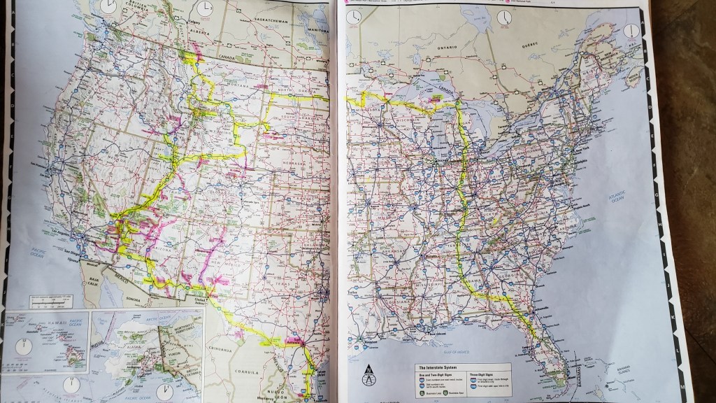 The story so far. The full track of our trip in Fati is in yellow, and our multiple side-trips in Nippy are shown in pink. We still have another 1,500 miles or so to get home!
