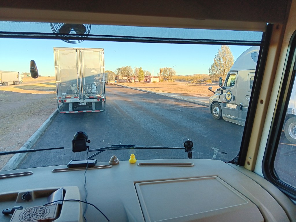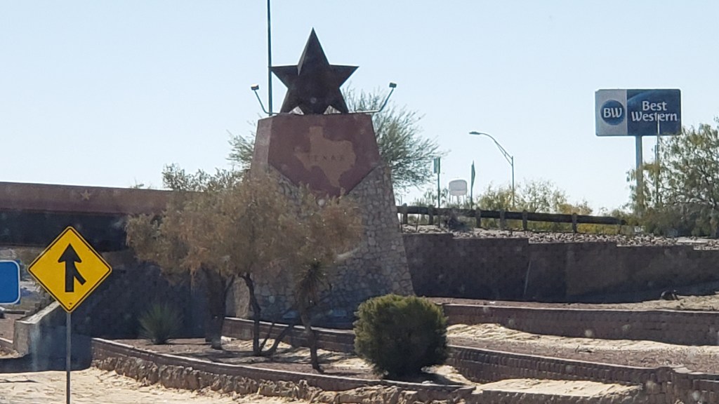 Everything is bigger in Texas, and that includes distances. We try to limit our driving in Fati to 200 miles or less per day, and it was 271 miles to our next campground, so we boondocked at a handy pull-out off I-10 in Van Horn, just a few yards off the highway. There is a long strip of road running parallel to the interstate where trucks and RVs can rest overnight. This was our view: