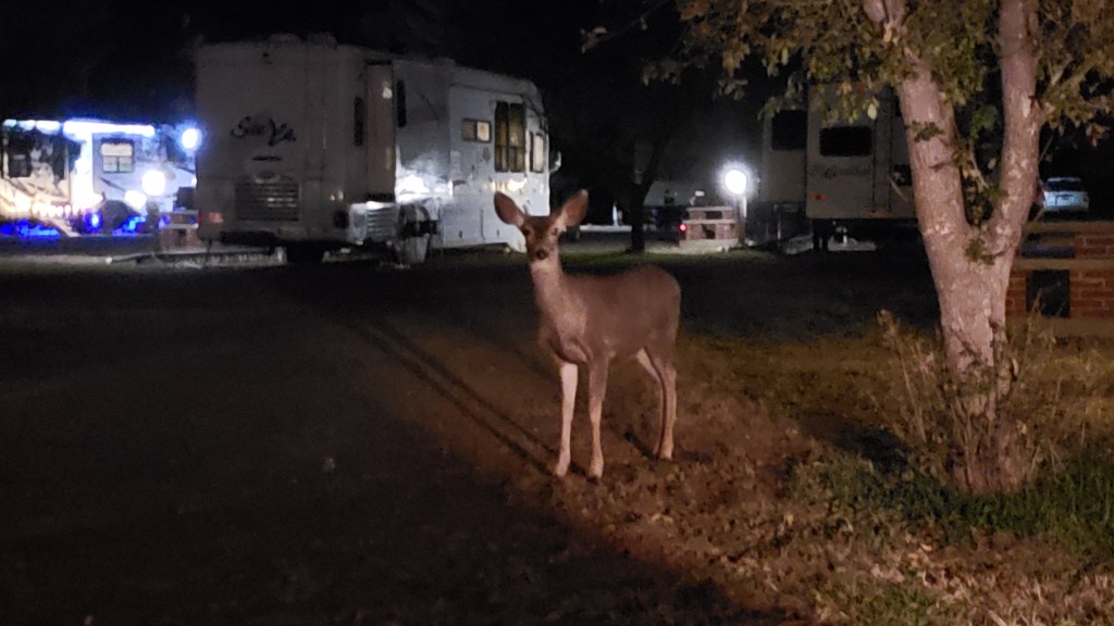 To confirm how right we were with our unreasonably bad attitudes, the Universe rewarded us with mule deer in the campground, not far from Fati, when we returned that evening. A day or so later karma rewarded us with a very sick dog. The two aren’t connected, but maybe we’ll be a bit more patient with our beer money next time.