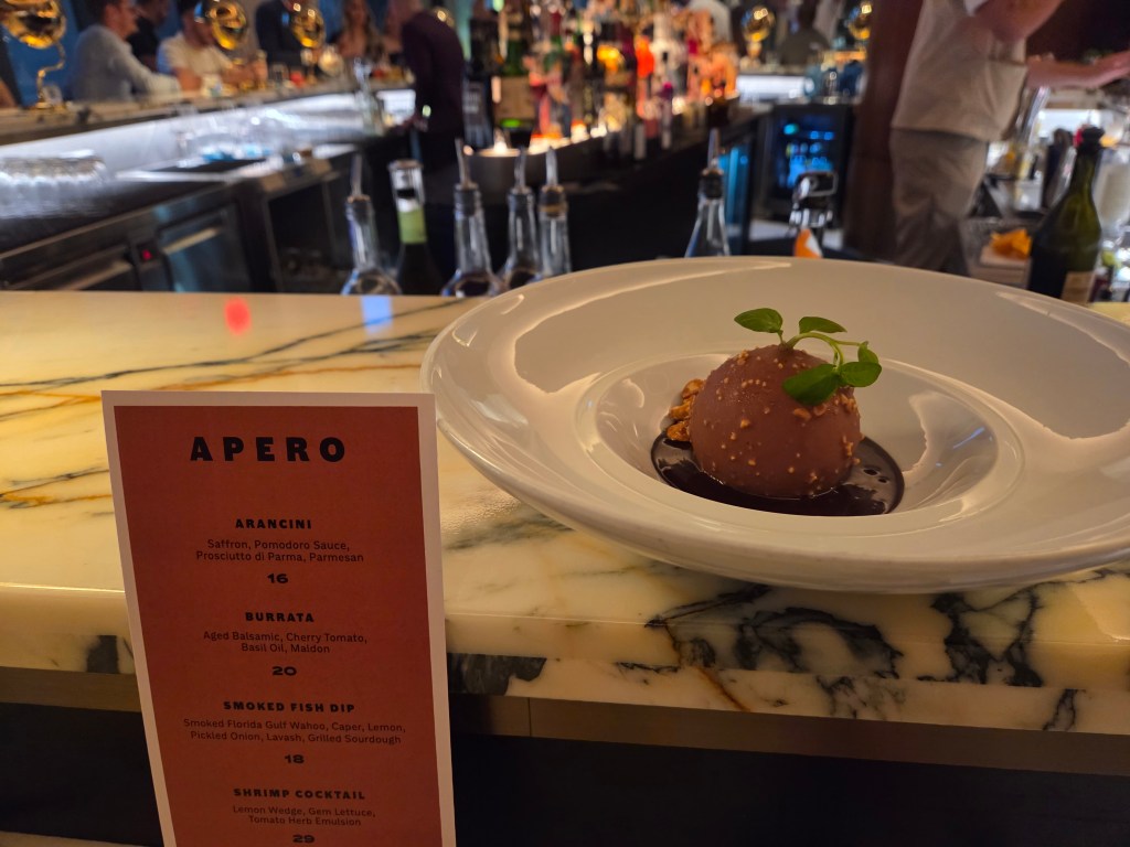 For dessert, we were tempted by both the Bread Pudding and Tahitian Vanilla Crème Brulee, but our barman, Francisco, insisted we try the Rocher, and boy was he ever right! This outrageously decadent over-sized ball of chocolate Frangelico semifreddo, salted caramel, chocolate cake, chocolate fudge sauce and macadamia nuts is simply our new favourite dessert anywhere in Orlando, and there’s a fair bit of competition for that.
