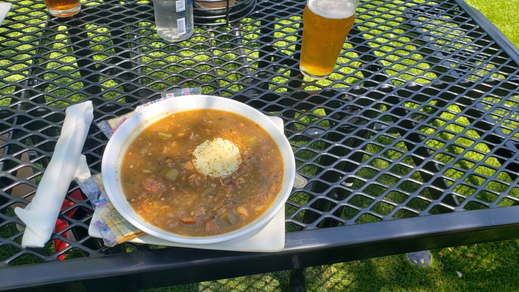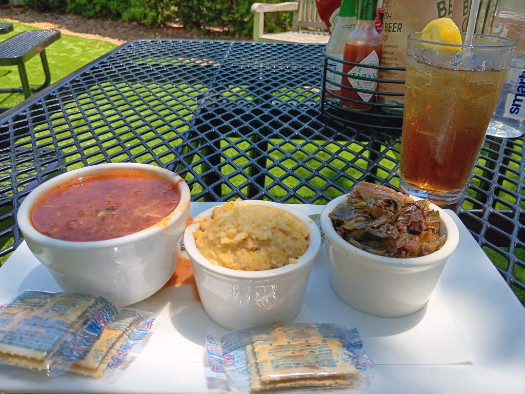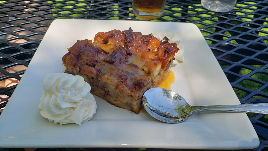 But we’d already eaten, having stopped at Beach Camp Brewpub, not realizing Seaside was so close. Still, Simon had a huge bowl of gumbo and a beer, Susan went for a cup of Brunswick Stew and iced tea, and we split sides of cheese grits and collard greens, all of which were delicious. Simon being Simon, Sticky Toffee Bread Pudding rounded off a fine meal.
