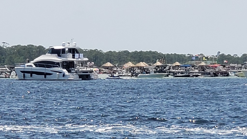 We could see it well from the marina, but had an even better view as we crossed over the William T. Marler Bridge (Highway 98). It was jam-packed on that sunny Friday afternoon, with weather in the high 80s, and we imagine it’s shoulder-to-shoulder and boat-to-boat in high summer.