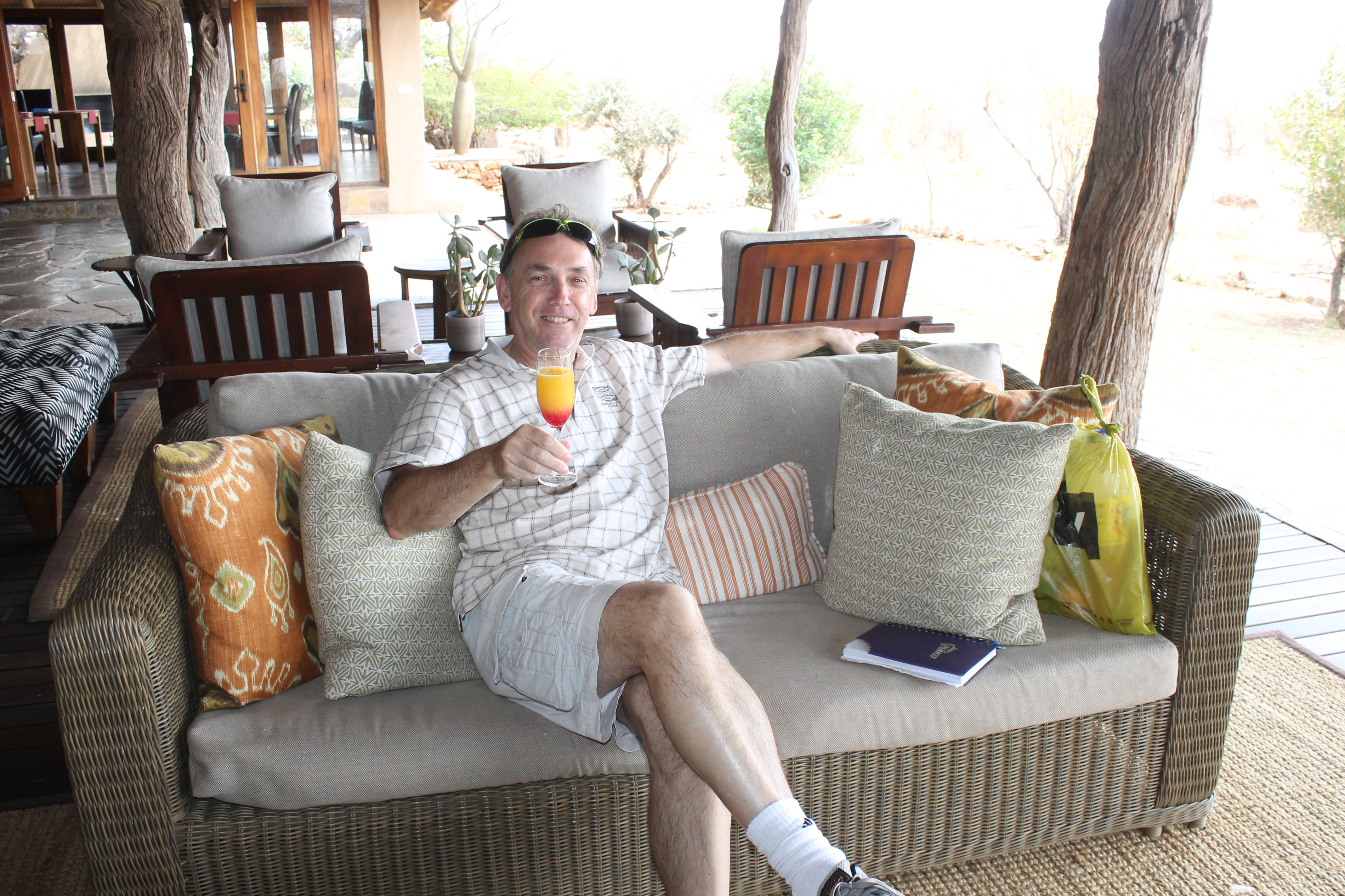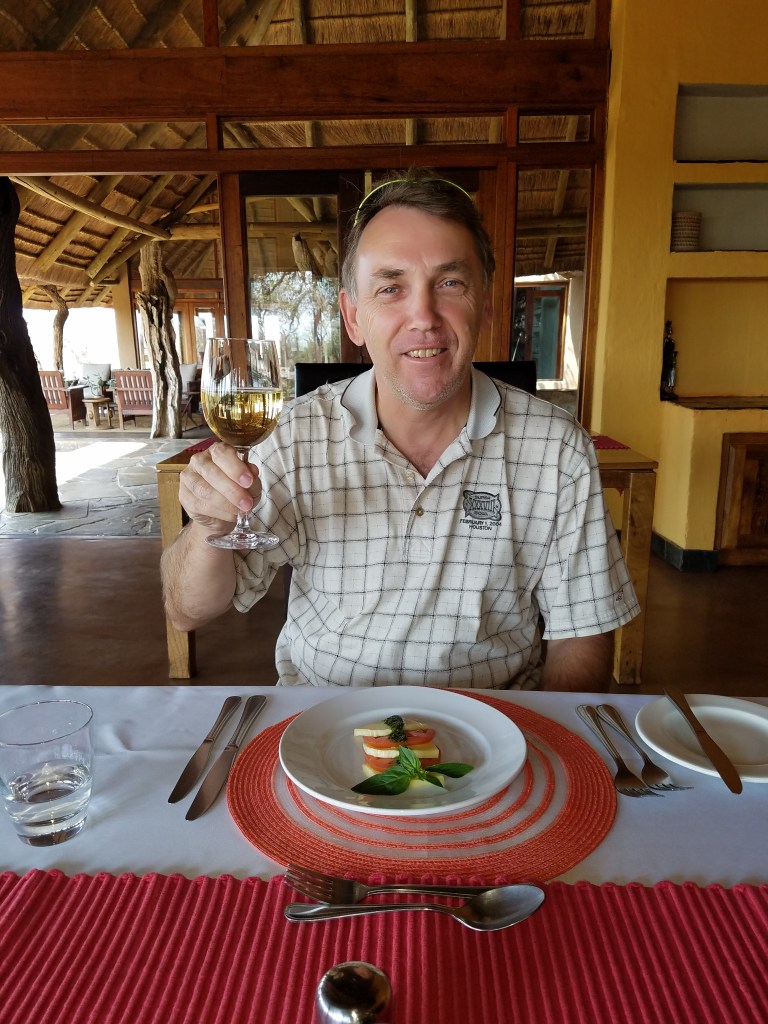 We were treated to our own table for two at lunch, as the rest of the resort’s guests were still out on their morning game drive, so we had the place entirely to ourselves, with our own server. A nice caprese salad arrived, followed by chicken, risotto and a delicious side of collard greens. Sadly, Simon’s glass of wine was blown over by a gust of wind and landed in his starter, but his glass was soon re-filled (although the table-cloth was Ieft soaking in chardonnay!).
