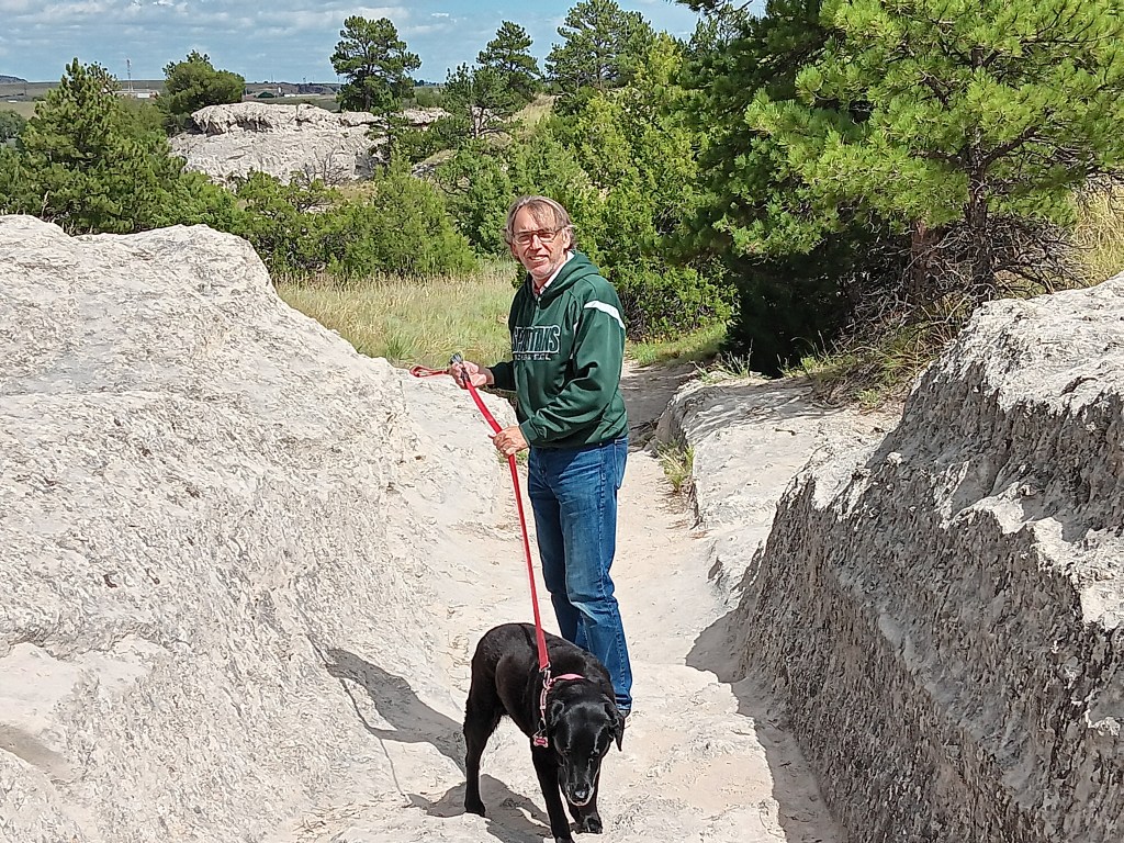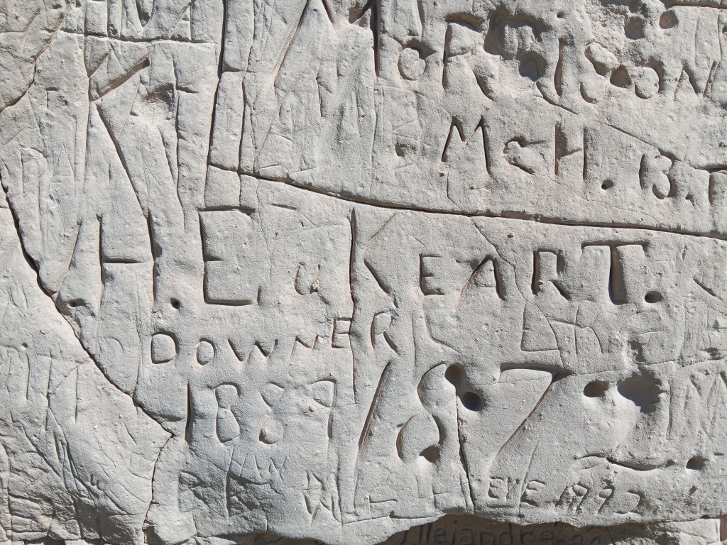 We didn’t see the earliest dates that have been identified on the cliff (1797 and 1829), nor did we see petroglyphs and pictographs made by the native people long before white people arrived, but we did see some carvings from the mid- to late-1800s, and many carvings behind a fenced area are from the time the Oregon trail was heavily used.