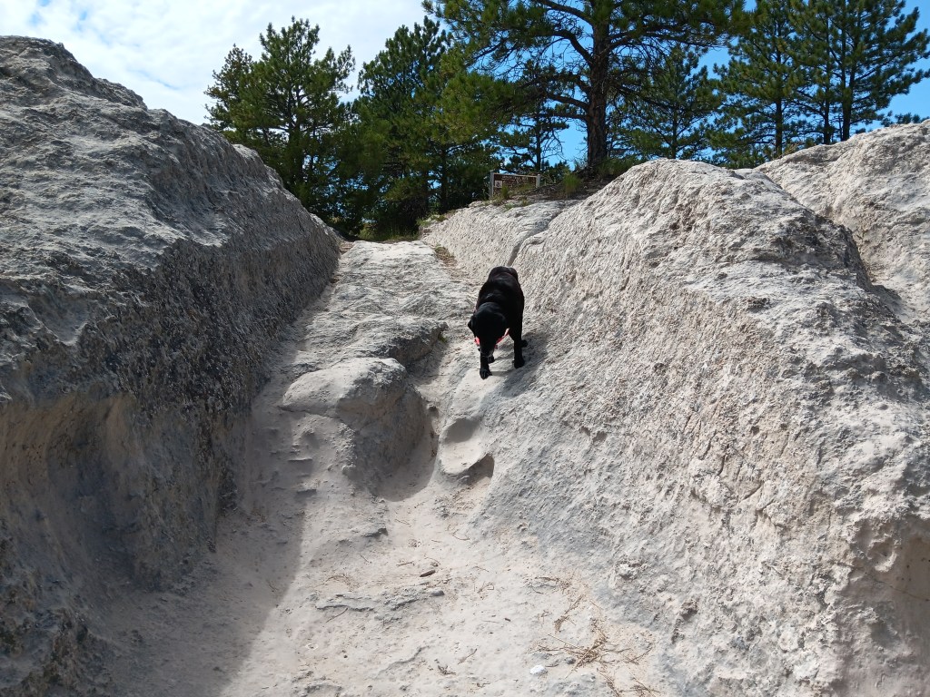 Another geological landmark the westward expeditions looked for was Devil’s Gate, near Martin’s Cove, a gap that allowed them to travel south of the area’s impassable river gorge. All four “trails” passed through this gap, and their wagon and handcart ruts are still visible. We couldn’t see them, nor the former Martin’s Cove camping site the travelers used, because (say it with me…) NO DOGS are allowed on the trails.