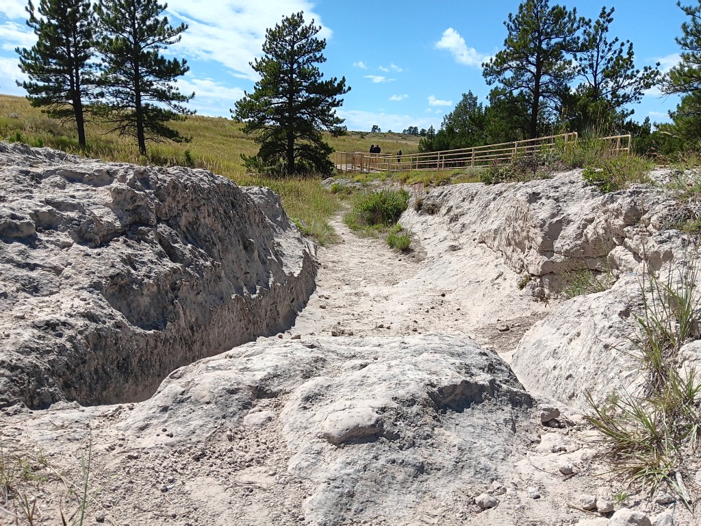 The Guernsey Ruts are located at Oregon Trail Ruts State Historic Site, where wheel tracks made by covered wagons and handcarts left deep gashes in the soft sandstone, which are now on protected land. Some are five feet deep, and it’s easy to see the wheels’ furrows and the deep pathway where people walked next to their wagon.