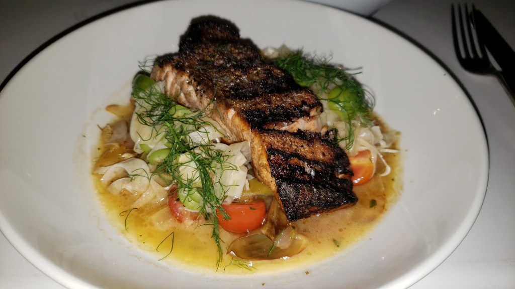 For dessert, we were tempted by both the Bread Pudding and Tahitian Vanilla Crème Brulee, but our barman, Francisco, insisted we try the Rocher, and boy was he ever right! This outrageously decadent over-sized ball of chocolate Frangelico semifreddo, salted caramel, chocolate cake, chocolate fudge sauce and macadamia nuts is simply our new favourite dessert anywhere in Orlando, and there’s a fair bit of competition for that.