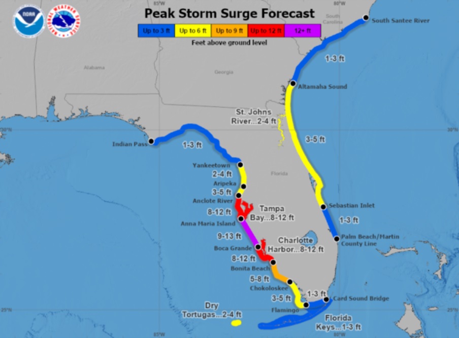The 5:00pm National Hurricane Center update also gave us an important revision of the storm’s track, for the first time showing it as “probably” coming ashore on or just south of the city of Sarasota, which, if it holds, will be a major relief for a Tampa Bay that had been warned to prepare for a 10-15ft storm surge. Instead, it will be on the flip side of the surge and should escape the kind of ravages that had the mayor giving her dire warnings of death and destruction only a few hours earlier. Beautiful Anna Maria Island may also escape the worst of it, too.