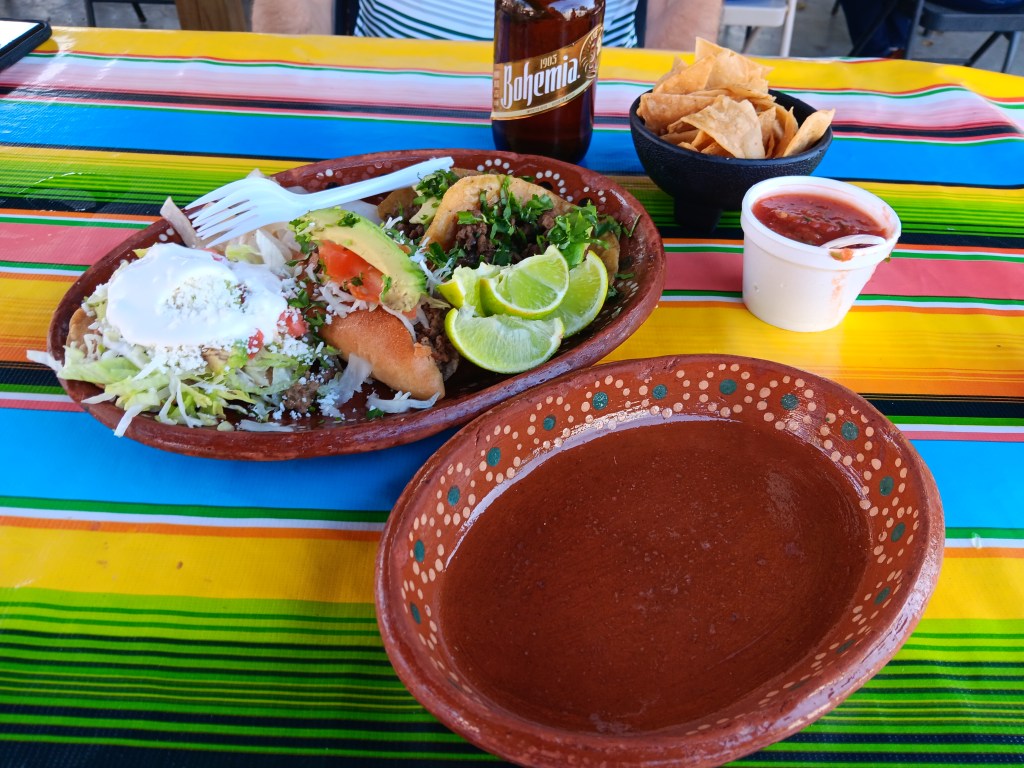 We agreed to split a Nana’s Sampler of two steak tacos, one chalupa, and one ground beef loncha, while Simon ordered a Bohemia beer. There were seven Mexican beers on the menu, and we only knew what the Corona was like, so Susan asked our server which ones were not too heavy, and not dark. The server wasn’t sure, but said she’d ask the bartender, so Susan said, “Thank you! Just have them surprise me.”