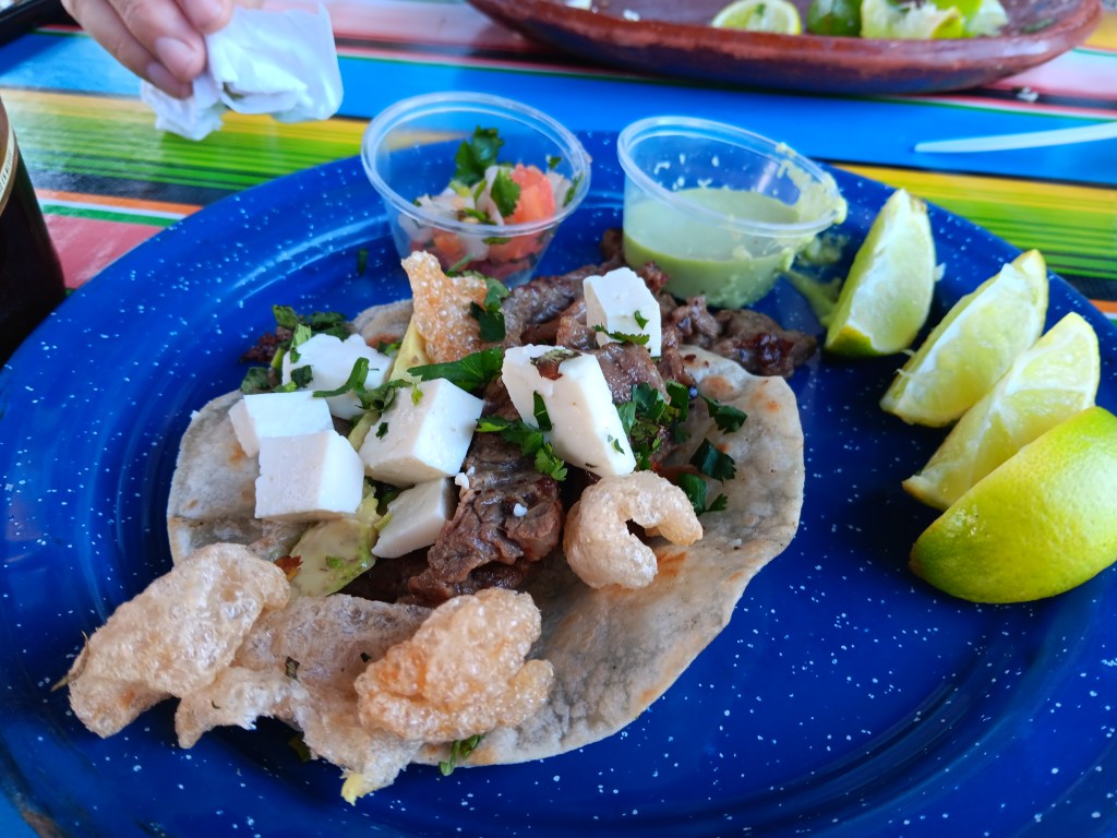 We gobbled like puercos (pigs), and when we were done we decided we weren’t done. Simon ordered the Tacos La Patrona, featuring three corn tortillas topped with fajita meat, queso panela, avocado, and chicharonne (deep-fried pork rinds).