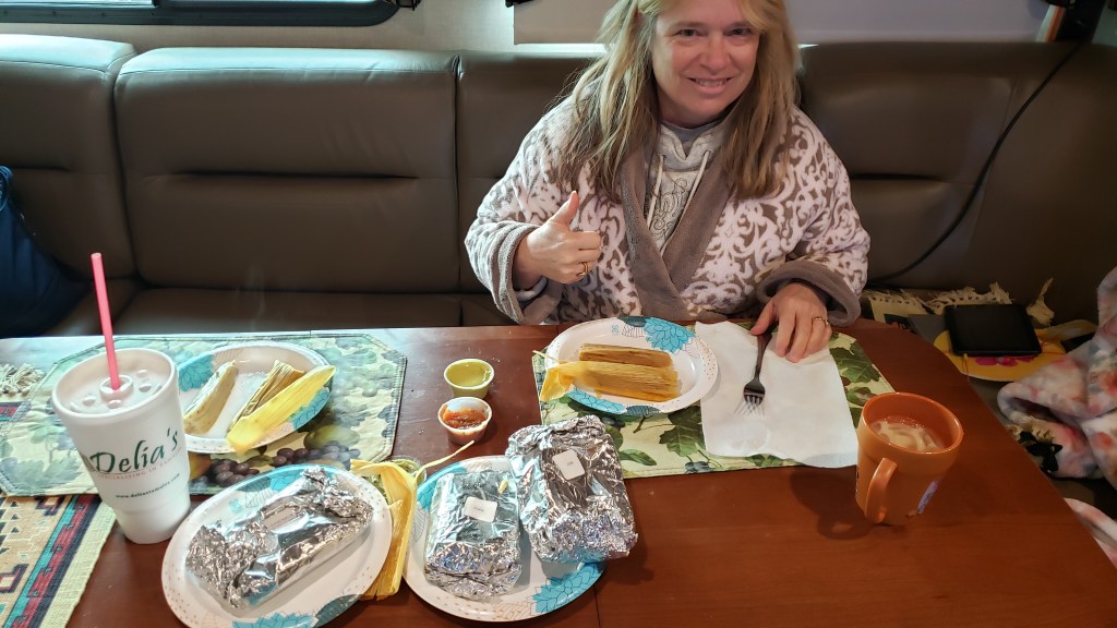 We did venture out into the freeze to pick up some hot tamales from Delia’s Tamales in San Juan, Texas, not too far away. Everyone around here says Delia’s are the best, so how could we say no? You can only order them by the half-dozen or dozen, so we got three half-dozens (pork, beef, and spicy chicken in green sauce), and made them last for four meals each. A gigantic to-go cup of Horchata was enough for two. Score!