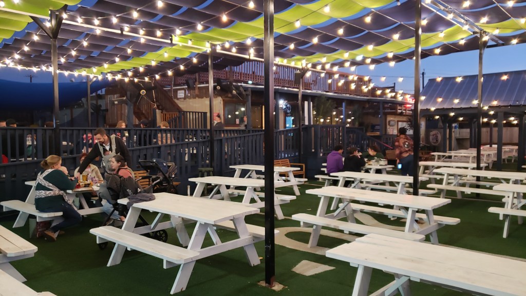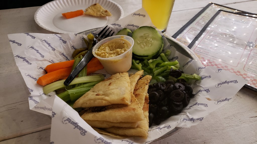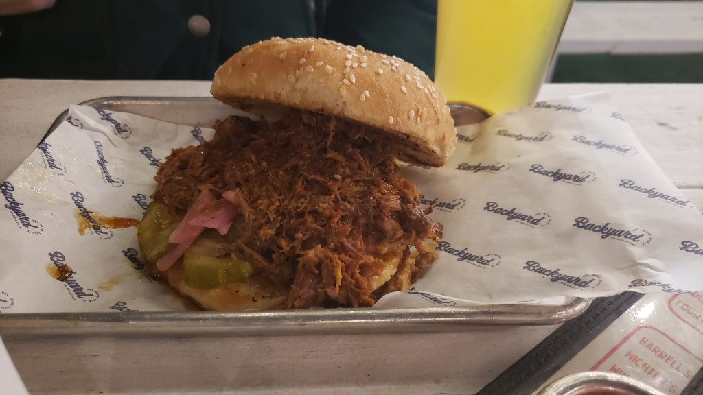 We were glad we only had a taco for lunch when we reached Backyard on Broadway that evening. Boasting the most enormous outdoor seating area we’d seen at any restaurant, anywhere, we grabbed a picnic table away from a group gathering and a load of excited children, and were rewarded with a quiet meal. It was incredible how little the sound traveled.