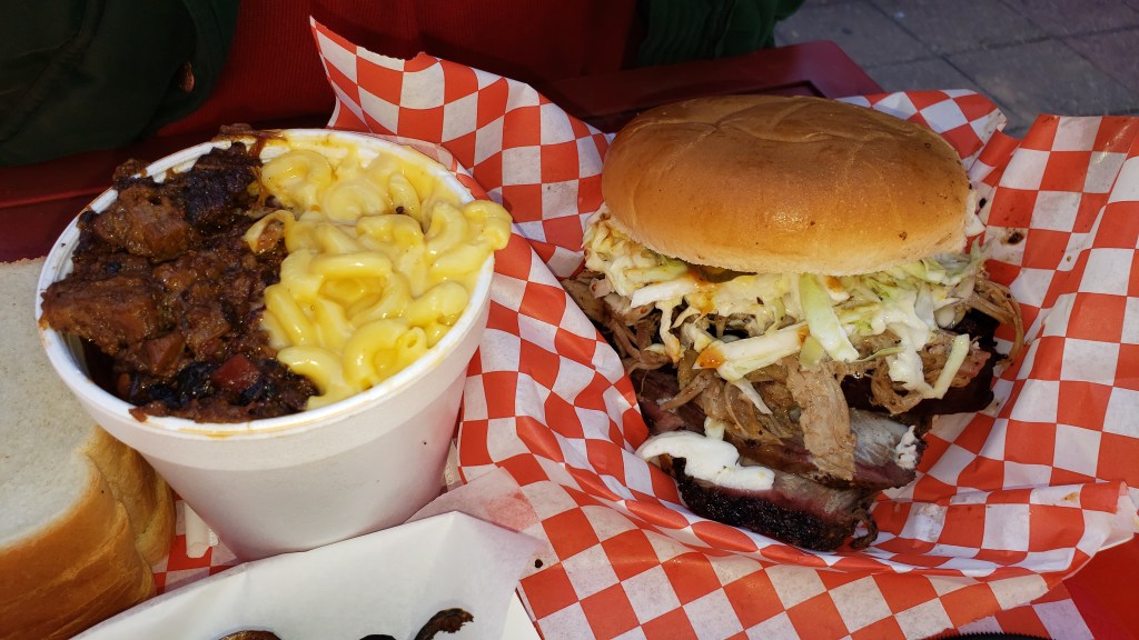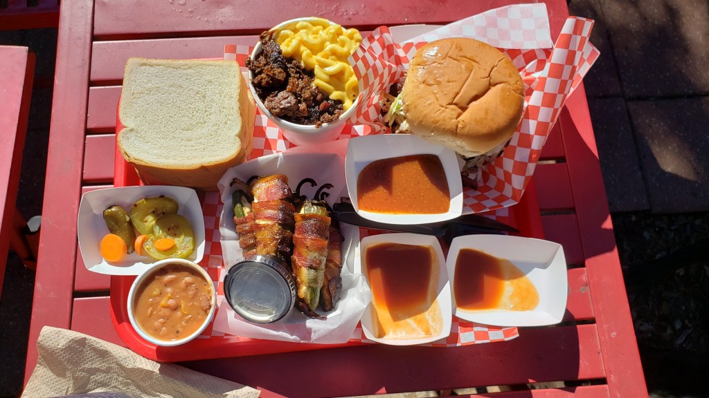 “What should we try?” Simon asked the manager, and he came away carrying a tray loaded with smoked jalapeno poppers wrapped in bacon; BBQ baked beans; Texas-sized bread slices; a massive Big Bro Sandwich piled high with smoked brisket, smoked pulled pork, and an entire sausage, topped with pickles and coleslaw; and a pint of “Cheesy Chop,” made up of chopped smoked brisket and mac & cheese. Lord help us!